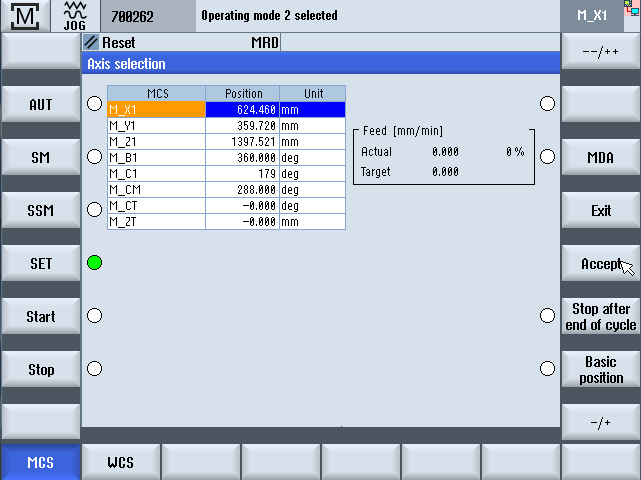 Change to "JOG" NC mode with JOG. The NC axes in Channel 1 are shown. The values for position, feed, spindle and tool for the basic machine