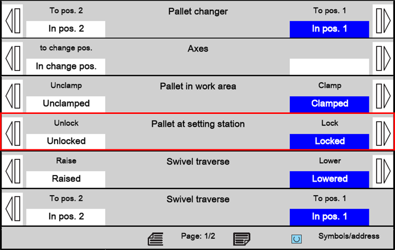 The "Pallet at setting station" function locks or unlocks the pallet on