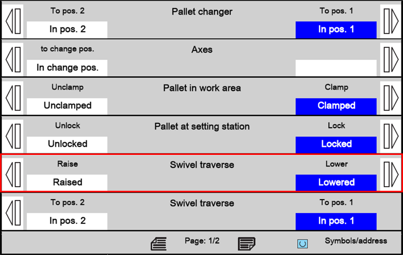 The "Swivel traverse position 1 or 2" function swaps the pallets at