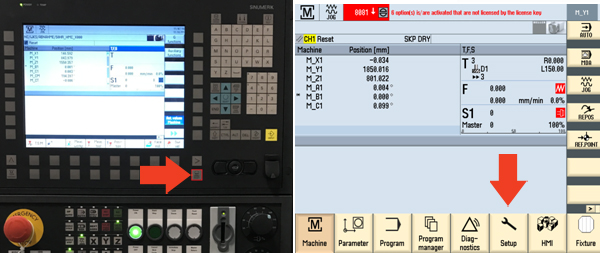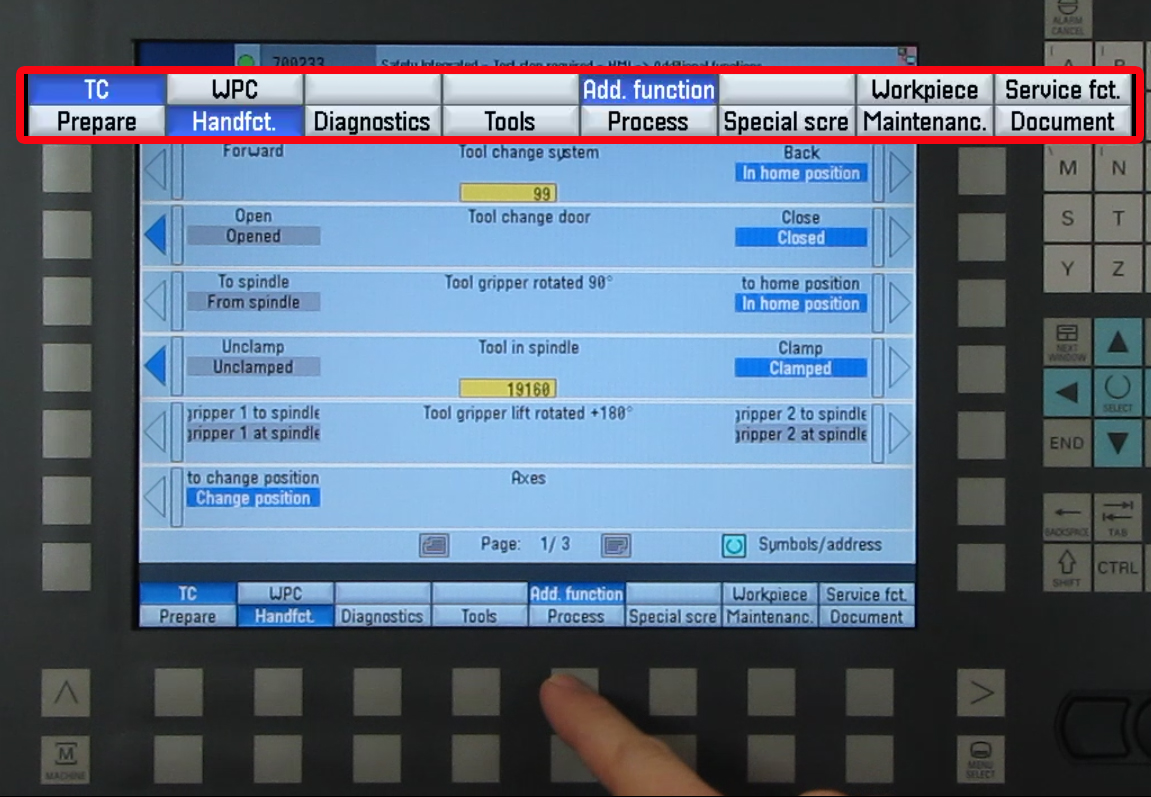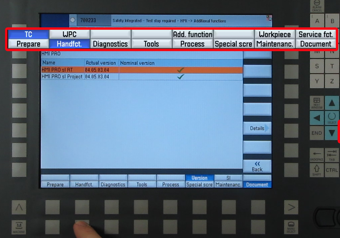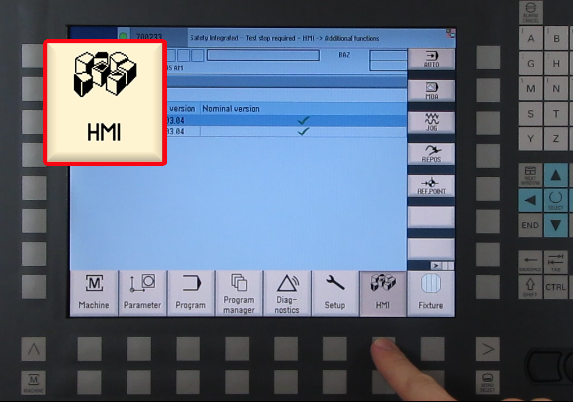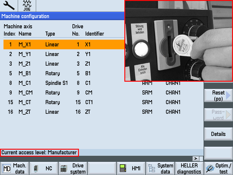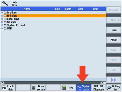 The key holder is a write/read system with integrated evaluation electronics and interface. For operation, the electronic key is inserted into the key holder and held in place by a spring clamp. The power for the transponder and the data is transmitted without physical contact between the key holder and the electronic key. Electronic Key ManagerThe key is managed for various access levels by the "Electronic Key Manager (EKM)" software at a separate PC workstation. Disabled Collision MonitoringMain menus with switch on/switch off collision monitoring, e.g. individual functions, are exposed to a higher risk. Particular care and a rigid procedure are required when working with these functions. Therefore, the machine display and selection windows have been removed from the general protection stage concept (see "Operating in special situations" Chapter). When the machine is being installed on-site, the operator can arrange to have a special protection stage set up for this sensitive function, which only allows collision monitoring to be switched off under certain conditions. If you have to switch off collision monitoring for your particular task, let your supervisor know so that access to the function can be authorised. Ensure that on completion of the task, the access right to the machine is reset to its basic status. Step 1:To make a screenshot, go to the screen you want to copy. Then on the operator panel, press the control (CTRL) button and the letter "P" at the same time. When you do this, a camera will appear momentarily on the screen to let you know it has been copied. Make sure the password is set in the control before continuing Step 2:After the screenshot is made, to retrieve the screen shot press the Menu Select button and select Setup. Step 3:Once in the Setup screen, select System data. This will show a list of all the folders. Move the cursor down to HMI data and press the yellow input button. Once the folder opens, move the cursor down to Logs and press the yellow input button Step 4:Step 1:Preconditions