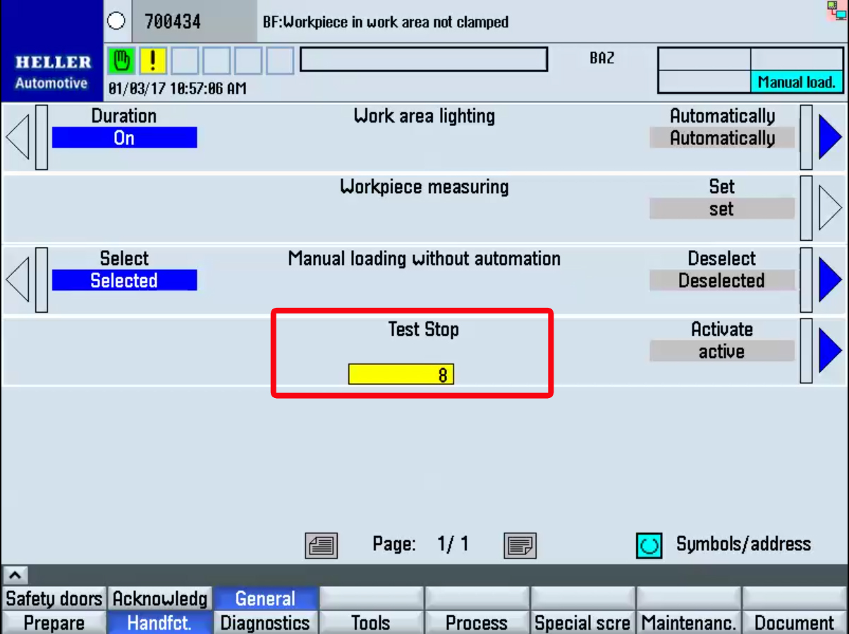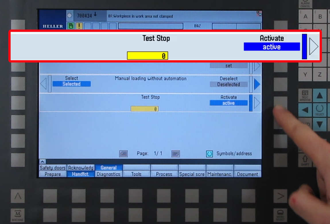 Step 2:Step 3:Step 4:At the Hand Functions screen, press the Additional functions upper horizontal softkey. Press General Functions if the General Functions menu does not appear. Step 5:In the General Screen- press "Activate" softkey on the "Test Stop" function. The active field will turn blue. Step 6:After the brake test is finished, a status message is output...