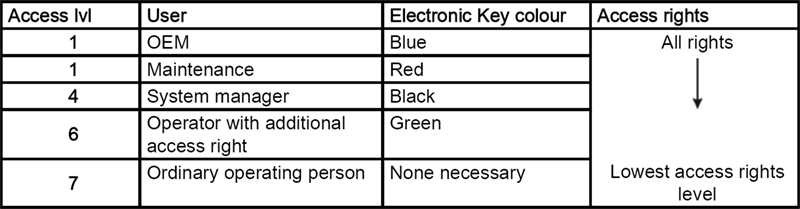 General FunctionsAccess Level ConceptThe unit controls use an access level concept for access to data areas and the special operating mode (setup). Access levels 1, 4, 6 and 7 have been declared for the access level concept on this system. Electronic KeyThese access levels are enabled by the Electronic Key System (EKS) in the machine control panel and the corresponding electronic keys. The colour-coded keys contain the access codes for the entitled group of persons concerned. When the machine is installed locally, the owner can have access to the special operating mode (setup) managed, e.g. by assignment to access levels 1, 4 and 6. These three access levels require a EKS key, whereas access level 7 does not. In the case of the latter, only normal operating mode (automatic) would be selectable. Electronic Key SystemThe Electronic Key System comprises two components: