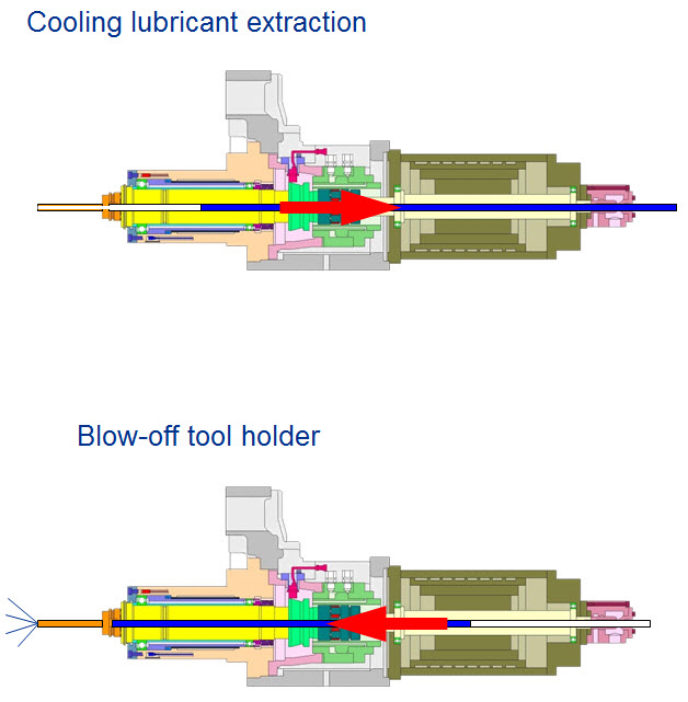 A malfunctioning extraction device is indicated by an increased volume of cooling lubricant being drawn into the tool magazine. Problems with clamping the tool into the tool spindle or reduced machining accuracy indicate inadequate blow-off. Procedure The machining program runs in automatic mode. Check wither the tool holding fixture is effectively blown off during a tool change cycle.