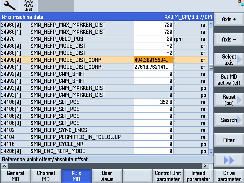 Tension Magazine ChainsInterval 5000 Hours Operating time Component Magazine chains To readjust the conveying station towards the tool changer place after clamping operation, the machine data has to be modified. You must hold the relevant access right. The control system accepts machine data input without confirmation. Overwritten data will be lost. Incorrect values can result in severe damage to the machine. Inputs take effect at different times according to level of effectiveness. Machine data must only be changed by specially trained personnel. Proceed as follows: