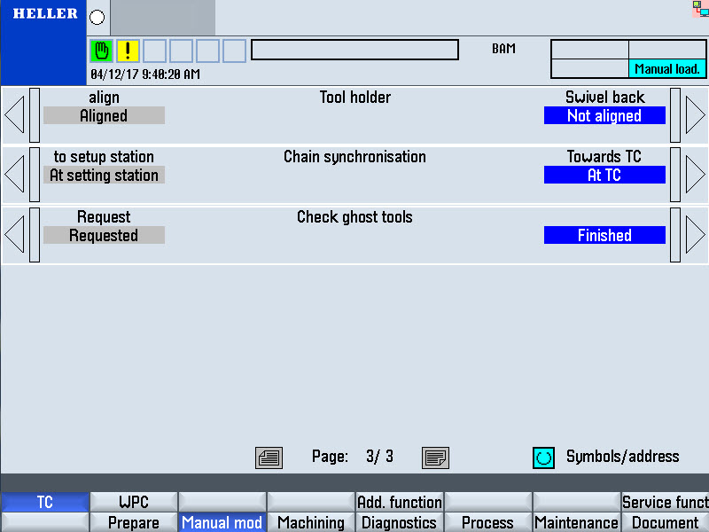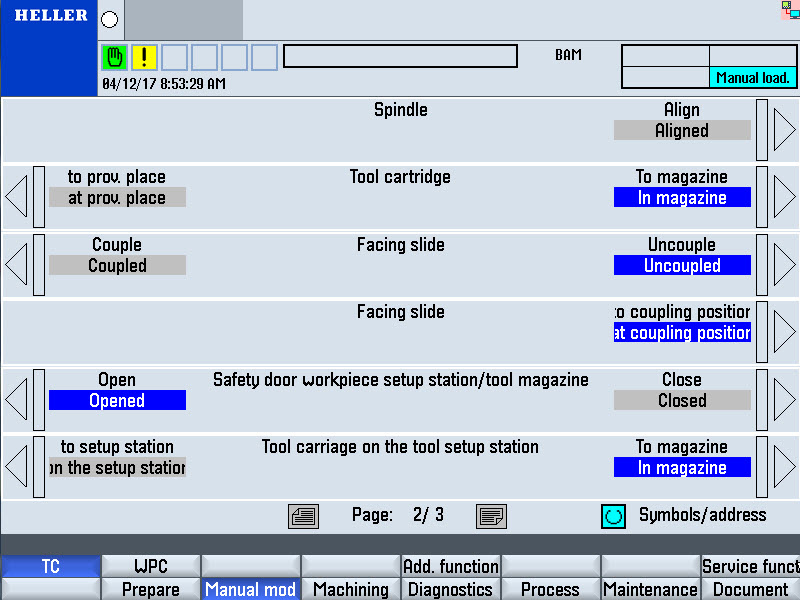 Step 2:Step 3:Step 4:Step 5:Step 6:Step 7:Step 8:Step 9:Individual function "Tool holder" to "Align". The chain synchronisation is switched over to the tool setting station. Step 10:Use the "Tool cartridge on tool setting station" individual function to move the tool cartridge to and fro between conveying station and tool loading position. At the same time, observe the tool cartridge movement. The tool cartridge must move back and forth without jerking. Step 11:Individual function "Tool holder" to "swivel back". The chain synchronization is switched over to the tool changer. Step 12:If the tool cartridge transport was not perfect, readjust the conveying station and repeat all checks. Loading the tool magazineStep 1:Move magazine place 1 to the cartridge unloading position. Depending on the magazine size, the following magazine place is located at the tool setting station: