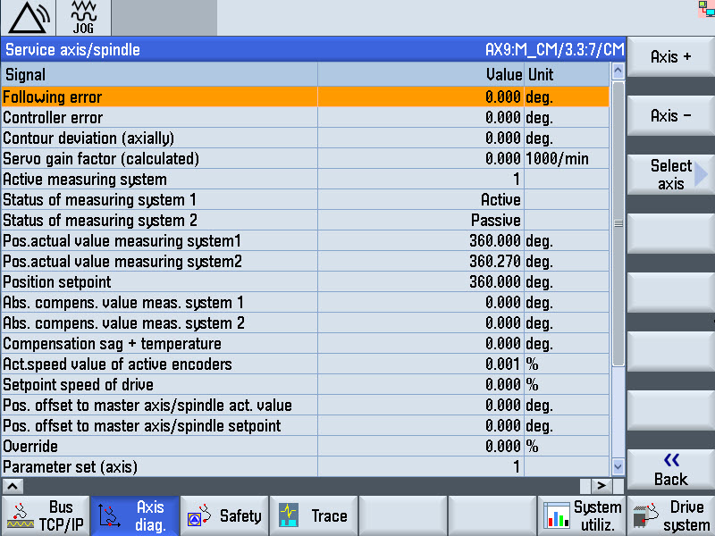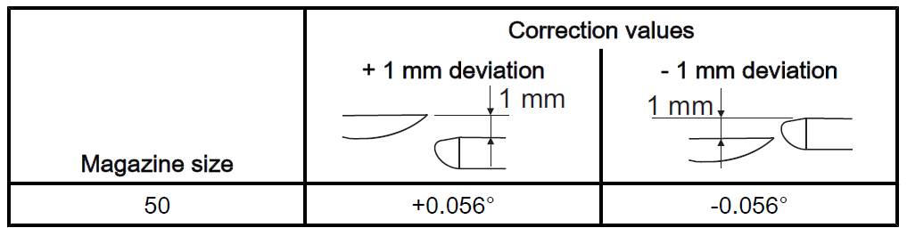 Step 22:Converting the deviation to angular degrees. Observe positive and negative values according to the following tables: Step 23:Step 24:Before closing the maintenance door, ensure that nobody is behind the guard panels. Close the maintenance door of the tool magazine. Step 25:Step 26:Step 27:Step 28:Step 29:Issue access authorization for the "Commissioning" main menu.